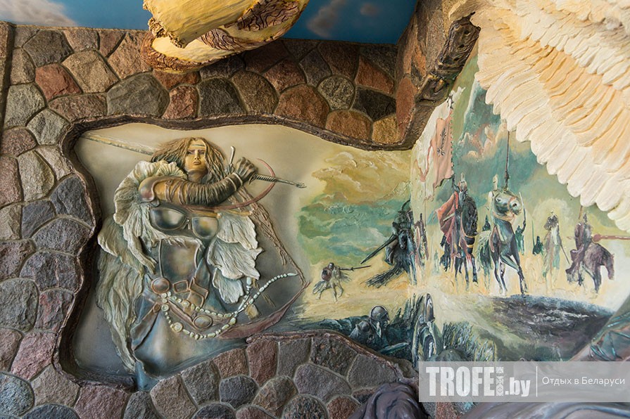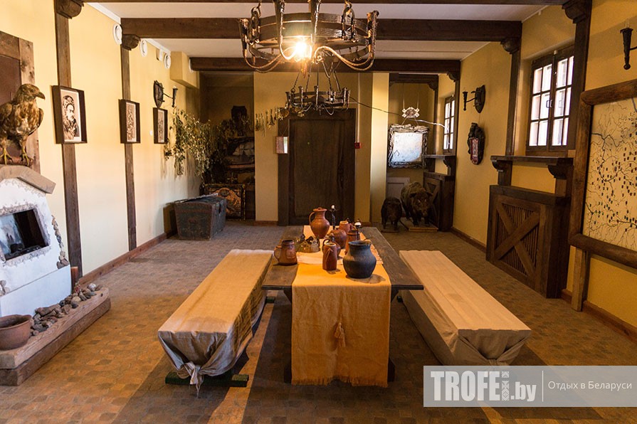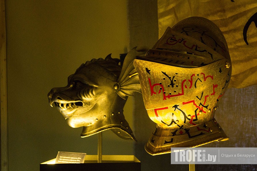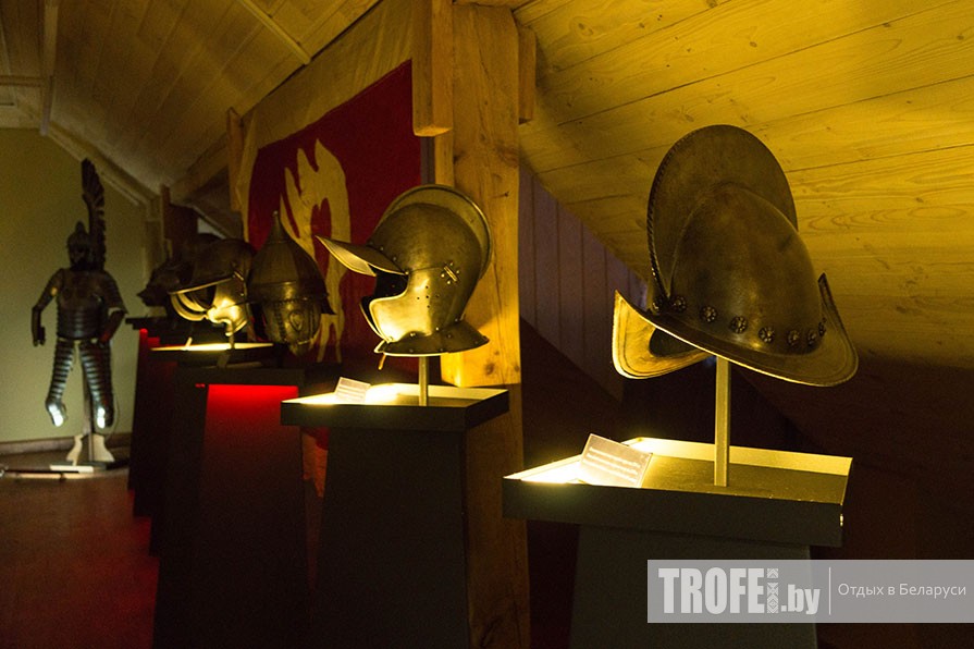 Нет, мы не на концерт, но за вход в замок все равно надо платить, входной билет стоит 5 рублей. Под звуки русской попсы обходим реконструированные владения Гедимина XIV века, осматриваем экспозиции замка. Самые интересные находятся в помещении. Это «Рыцарскі пакой» и сменная выставка шлемов и хоругвей от столичной мастерской «Стальное наследие».