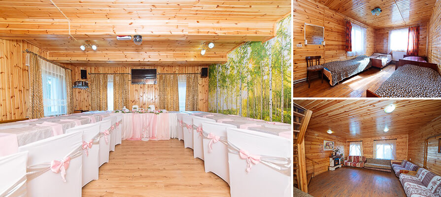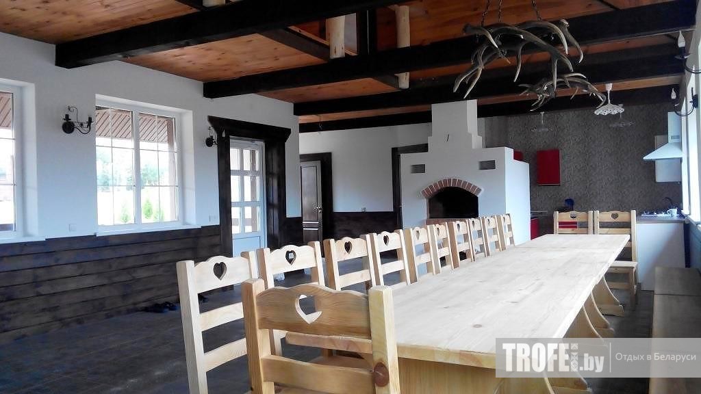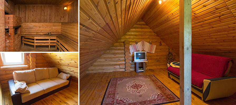 Самым дешевым коттеджем из тех, что мы нашли, оказался «Теремок» в Ельнице» – 900$* за двое суток при заполнении на 2/3 (а всего спальных мест здесь 30). В доме, кроме спален, есть банкетный зал, кухня, баня. Во дворе – пруд, беседка и большая терраса.