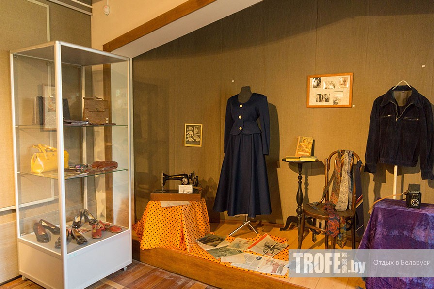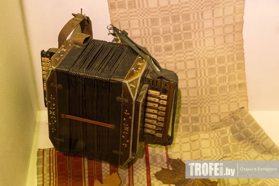 Быстро осматриваем постоянную выставку народных музыкальных инструментов и «Зал гобеленов», а также сменную экспозицию «Мода середины XX века», где даже успеваем немного послушать звуки старого патефона.