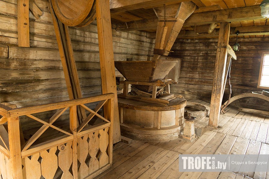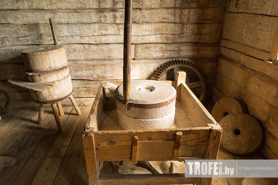 Дальше направляемся к этнографическому комплексу «Млын». В него входят мельница, дом завозников, кузница и амбар, но до закрытия мы успеваем посетить только мельницу начала XX века и дом завозников – своеобразную гостиницу белорусского местечка. Мельничные механизмы и история строения впечатляют и стоят того, чтобы провести здесь гораздо больше времени, чем мы.