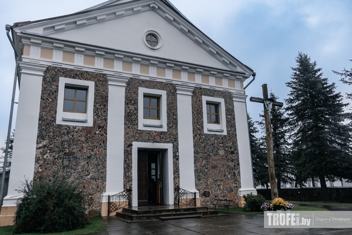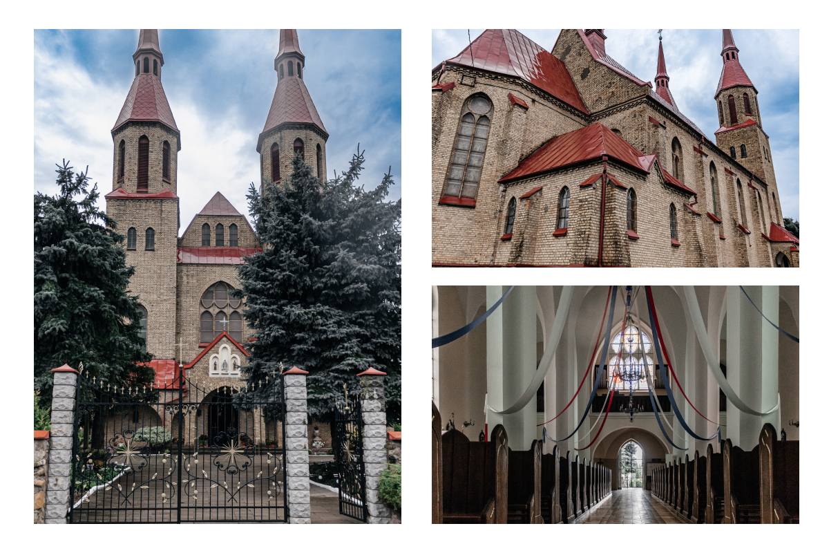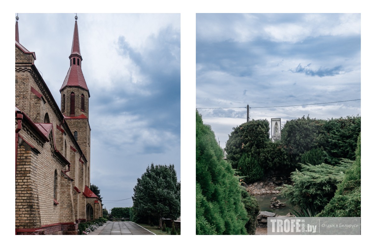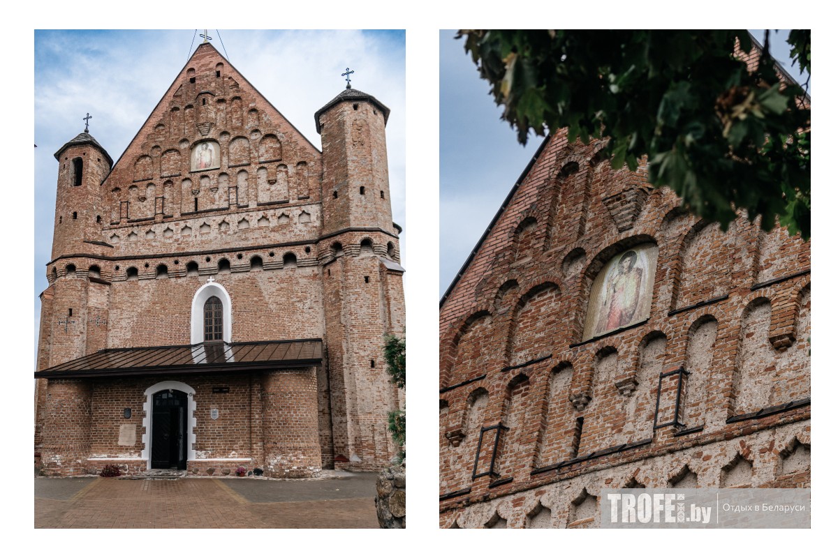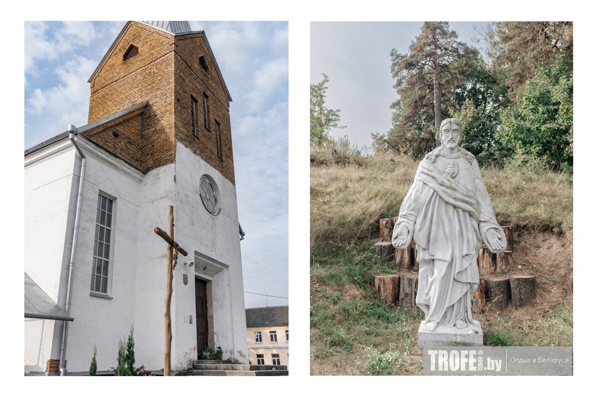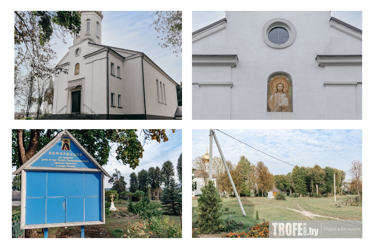Первые точки нашего маршрута – расположенные рядом православная церковь 1933 и костел 1938 годов. Если решите повторить нашу поездку, рекомендуем парковаться возле церкви: тут более благоустроенная парковка.