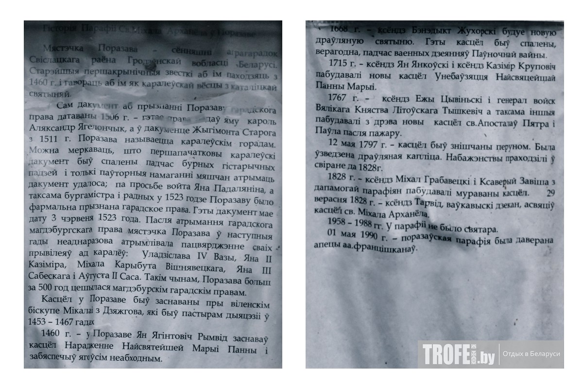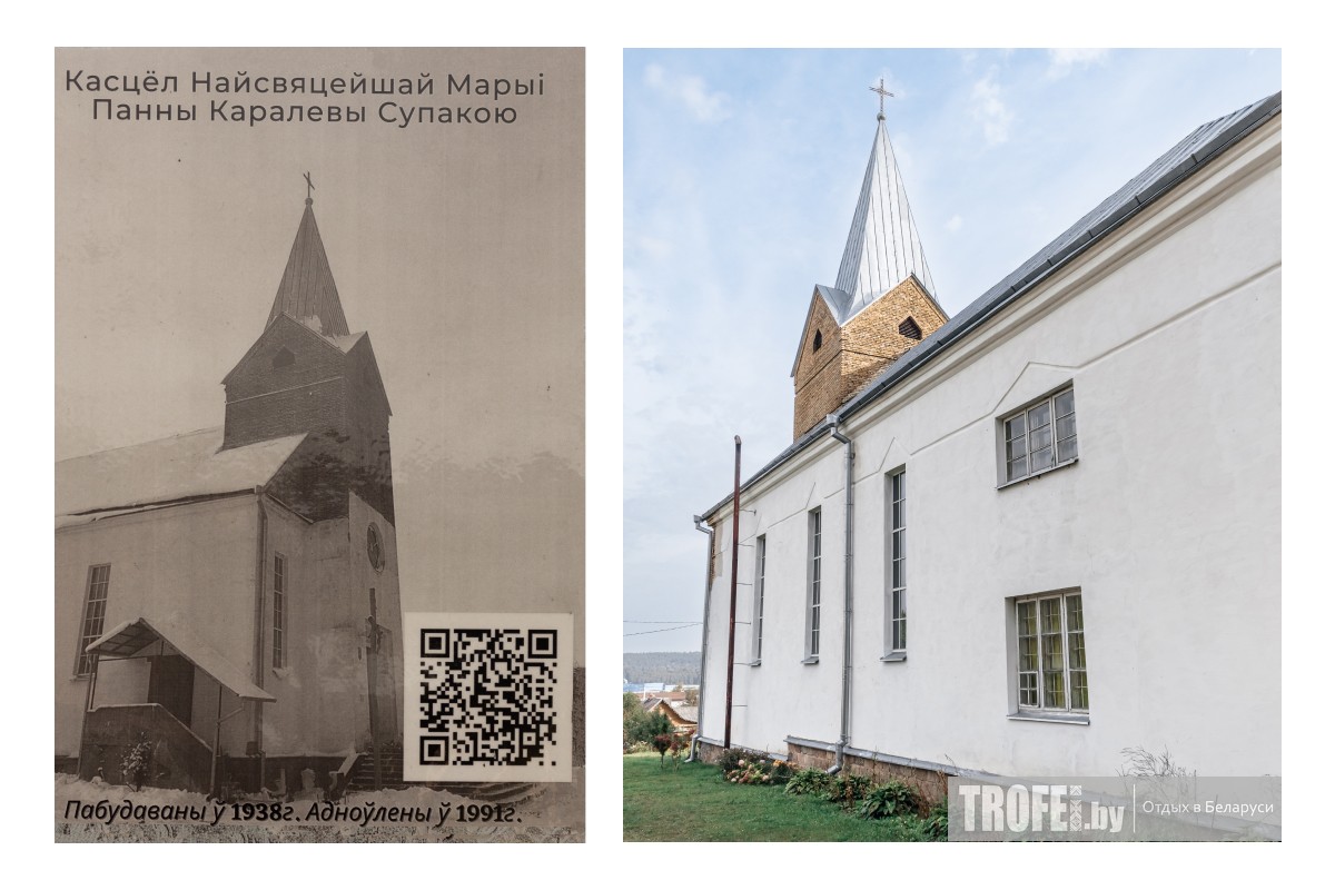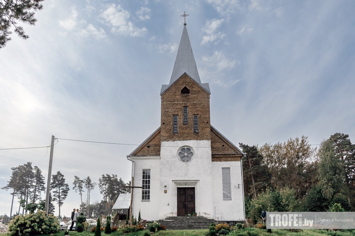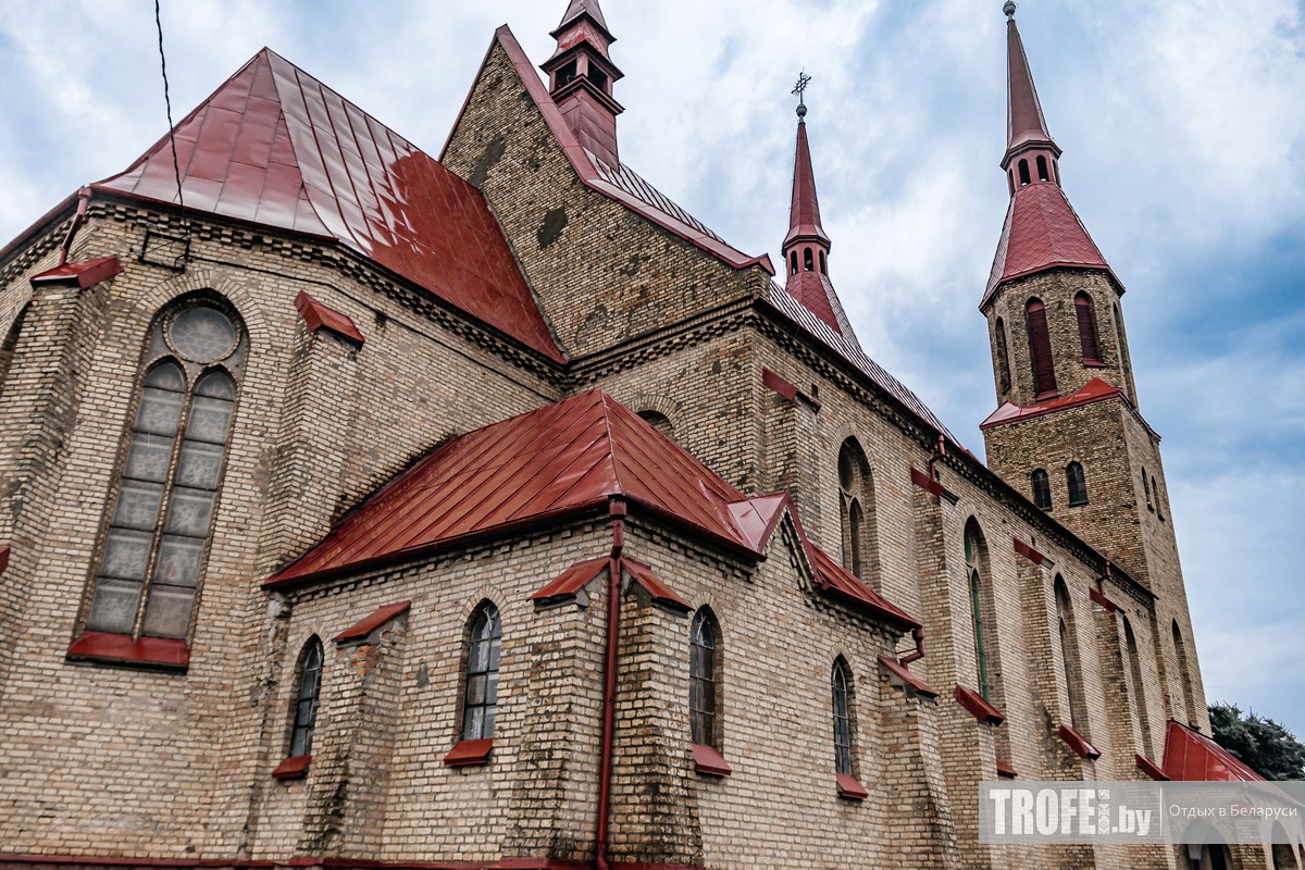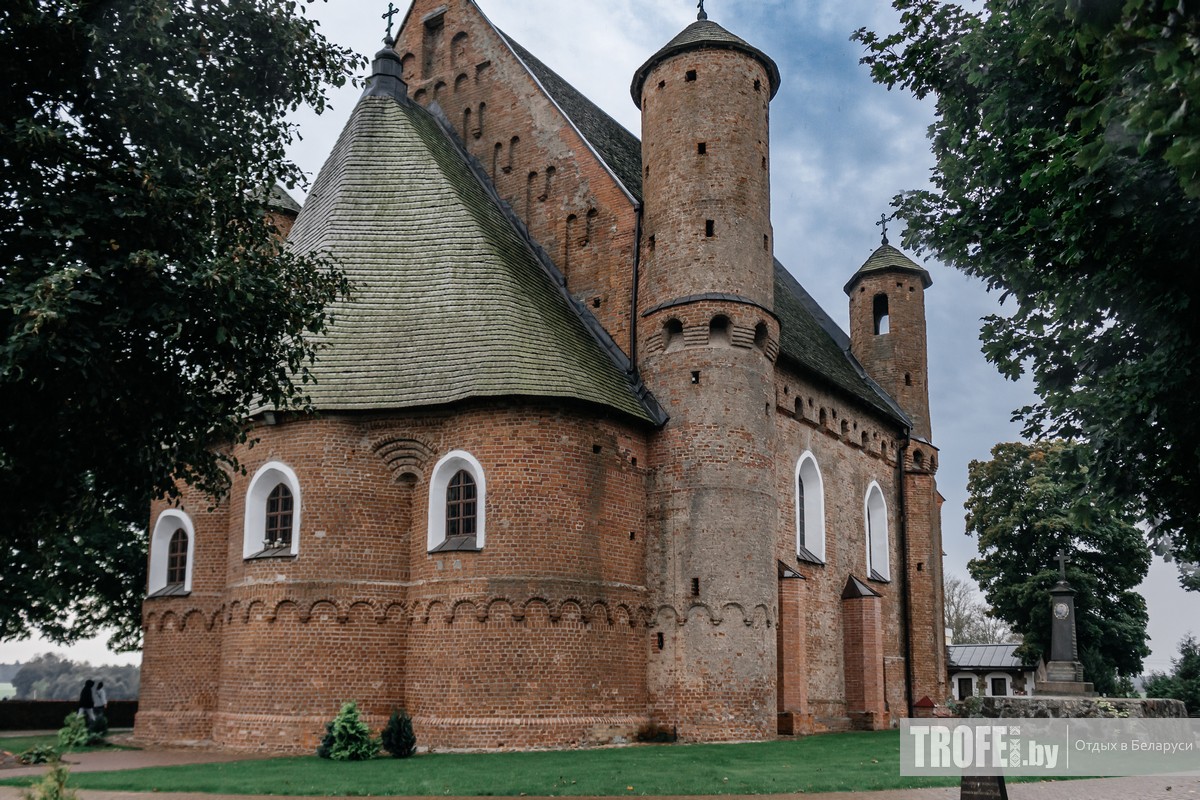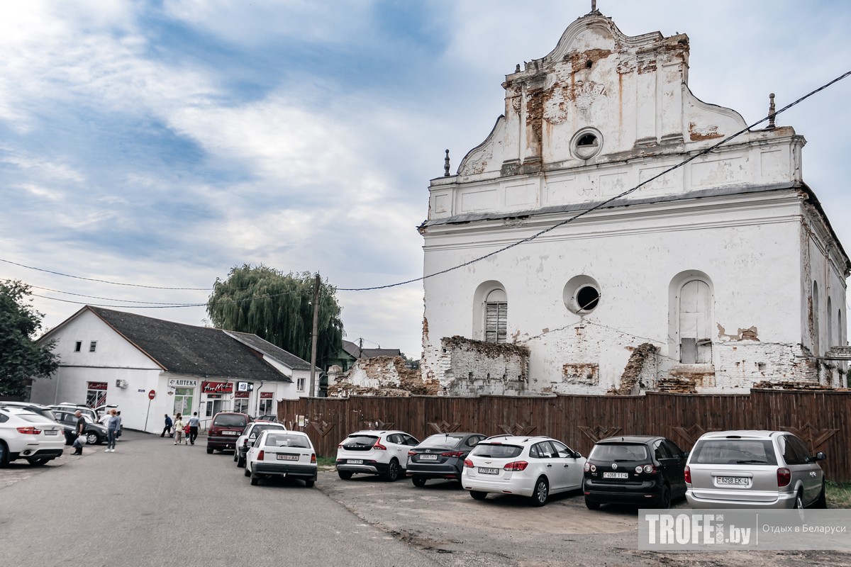 Первые точки нашего маршрута – расположенные рядом православная церковь 1933 и костел 1938 годов. Если решите повторить нашу поездку, рекомендуем парковаться возле церкви: тут более благоустроенная парковка.
