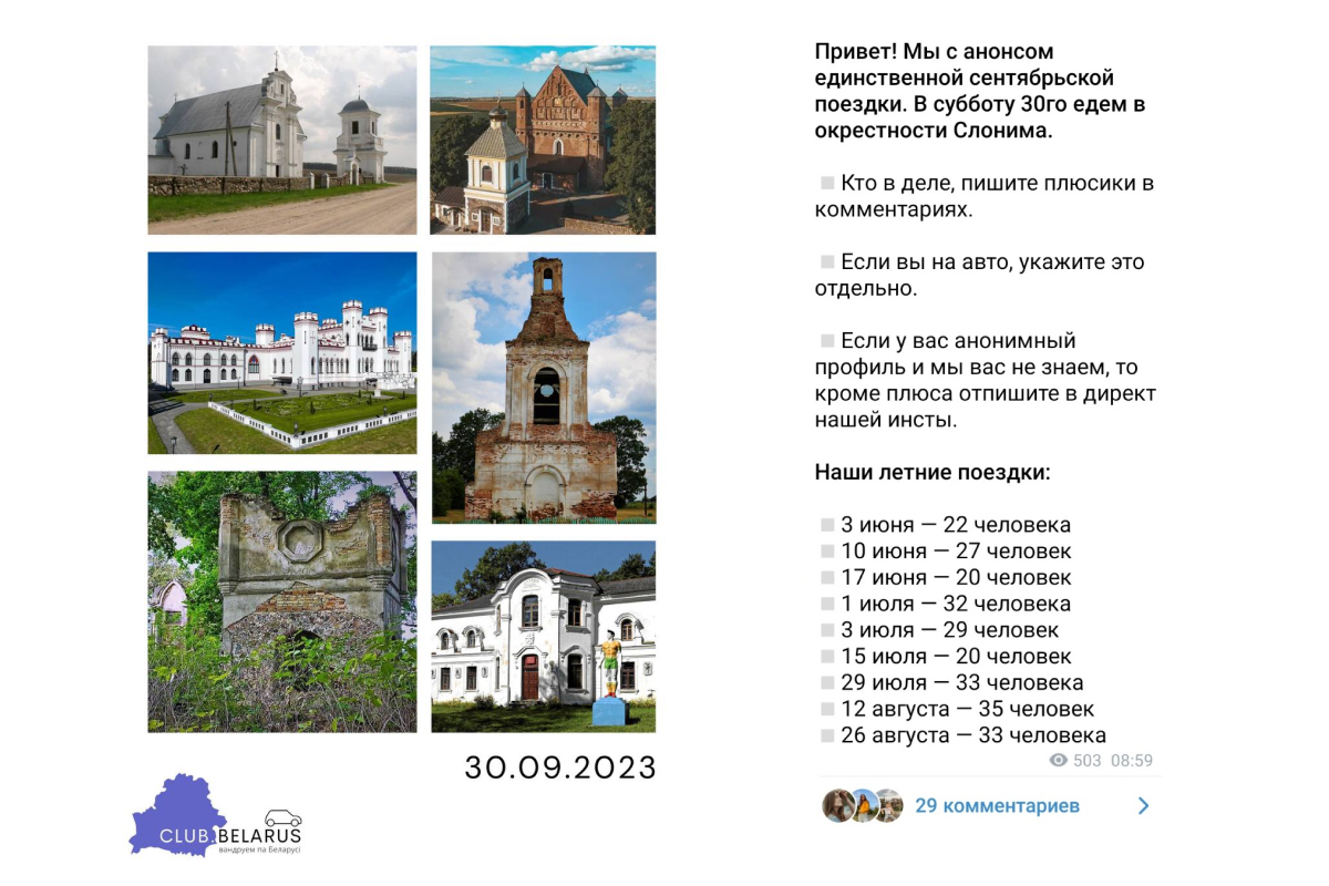 На следующий день после того, как мы отправили информацию, в Instagram приходит ссылка на чат поездки. Добавляемся и ждем 30 сентября. Из чата узнаем точку сбора и время выезда из Минска: стартуем 30 сентября в 8:00 с парковки торгового центра «Prostore» на пр-те Дзержинского. Тут же узнаем и первые точки нашего маршрута: православная церковь 1933 и костел 1938 годов, усадьба «Альбертин».