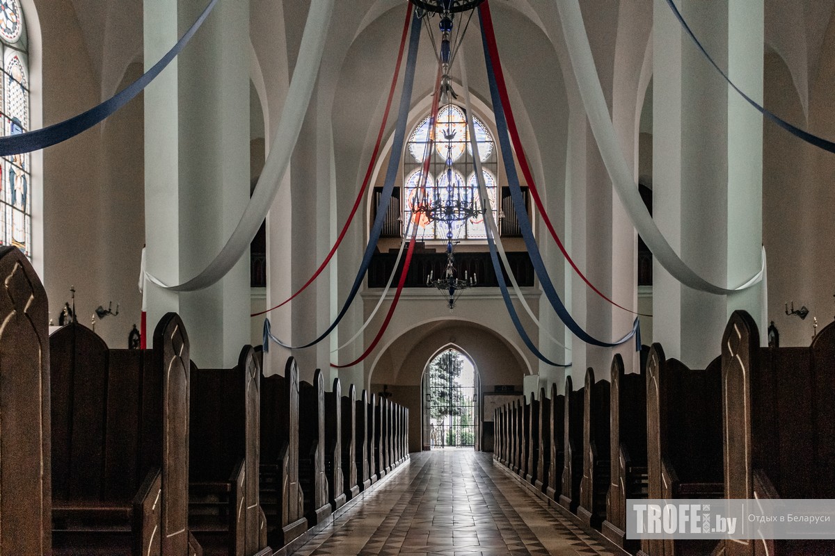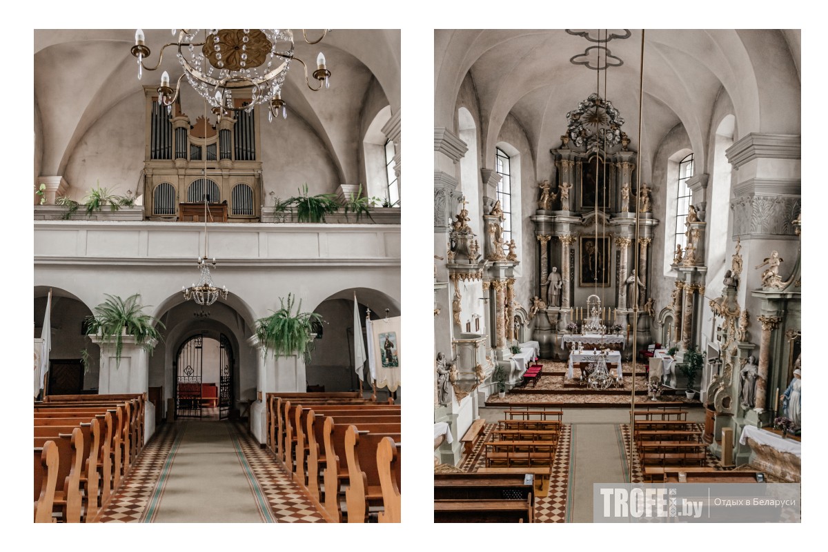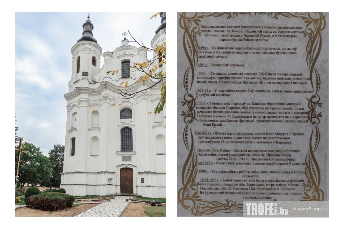 Чуть вдали от основных достопримечательностей Слонима расположен фарный костел Святого Андрея, который мы советуем обязательно включить в список мест для посещения во время поездки в районный центр. До поездки с «поехавшими» мы не особо часто бывали в костелах, поэтому сказать, что внутреннее убранство костела нас впечатлило, это ничего не сказать.
