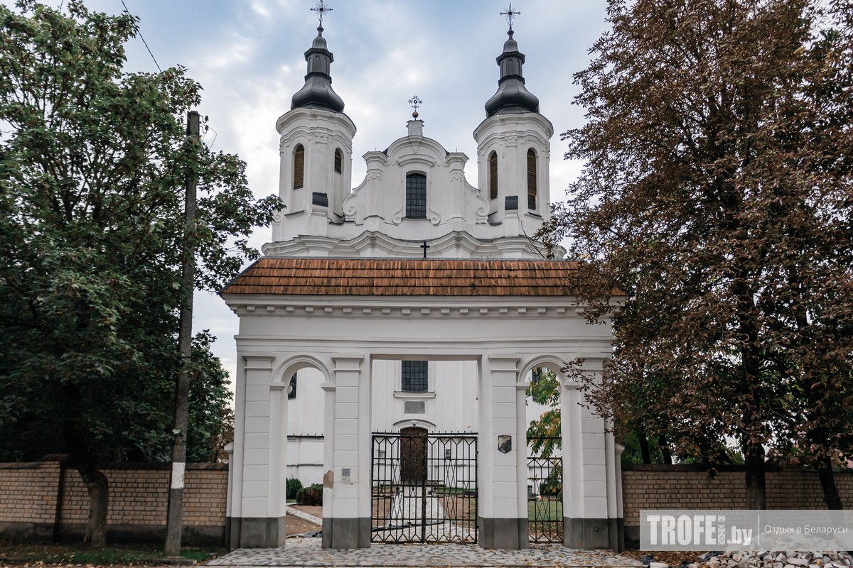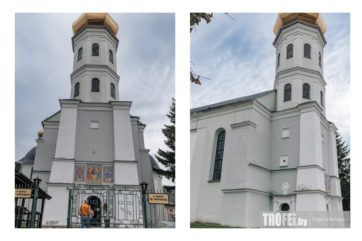 Здание Свято-Троицкого собора – архитектурный памятник раннего барокко с элементами и чертами стиля рококо. Изначально трёхъярусная башня была накрыта шатровой крышей, но в 2015 году её заменили на жестяной луковичный купол. Ознакомившись со сводом правил, размещенных при входе в собор, мы отправились к припаркованным возле сквера на Первомайской улице нашим авто, чтобы продолжить путешествие.