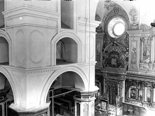 Внутри синагога имеет вполне традиционную планировку, свойственную большинству иудейских храмов. В центре широкого зала находится бима – возвышение, с которого раввин читает Тору. Композиционно-декоративный центр восточной стены – синагогальный ковчег (арон а-кодеш) – шкаф или ниша, где хранятся свитки Торы. Арон а-кодеш всегда находится возле стены, которая ориентирована на Иерусалим (в европейских синагогах она ориентирована на восток), чаще всего эта стена является также и главным фасадом. Над нишей для хранения свитков Торы расположен накладной фигурный картуш – лепная композиция в виде двух скрижалей, поддерживаемых львами и увенчанных короной. Вход в синагогу находится напротив Ковчега Завета, то есть в западной стене. Над входом размещается балкон – эзрат-нашим – место для женщин (мужчины и женщины в иудаизме молятся отдельно друг от друга).