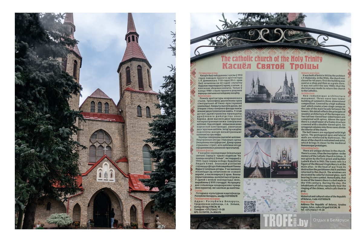 По плану следующей точкой нашего маршрута после церкви Святого Михаила Архангела в Сынковичах был г.п. Порозово, но так как после заброшенного спиртзавода мы решили не запускать навигатор, а следовать за впереди идущим авто из нашей компании «поехавших», следующей достопримечательностью, которую мы посетили, стал костел Святой Троицы в Зельве.
