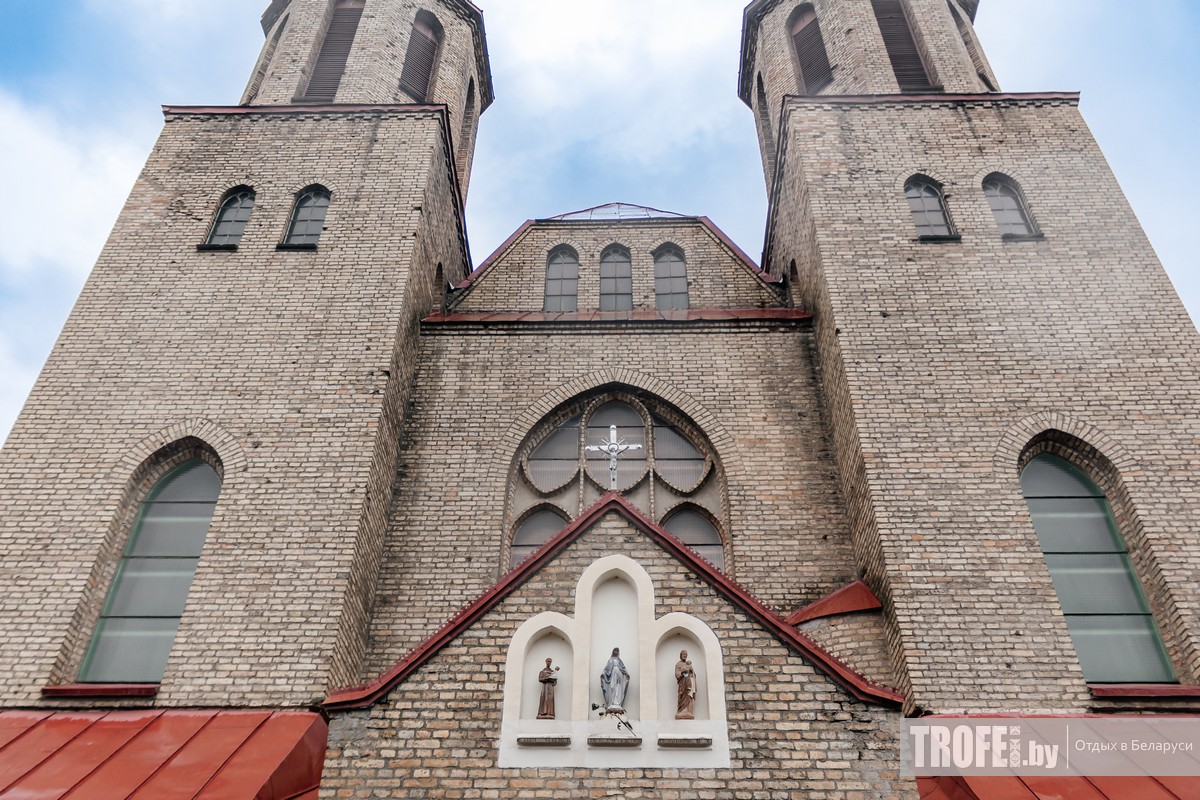 Следующей достопримечательностью на нашем маршруте стал Костел Наисвятейшей Девы Марии, расположенный рядом с храмом преподобномученика Афанасия Брестского. Исторических фактов об этой достопримечательности не так уж и много. Не работает и QR-код на информационной табличке. Построенный из кирпича в 1938 году костел – памятник архитектуры с элементами неоготики.