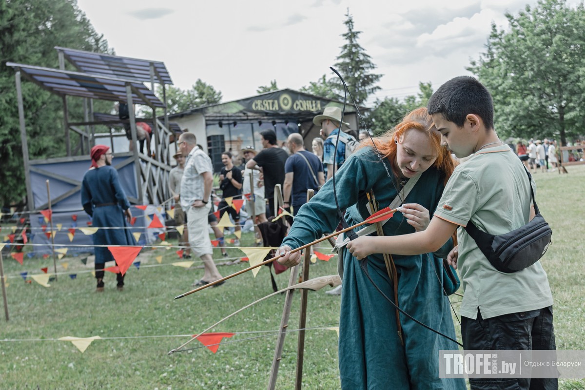 Слева и справа от сцены расположились интерактивные площадки, точки питания, город мастеров и купальская ярмарка. Целый ряд активностей предлагал Archery Club: за 5 BYN с человека можно было на 10 минут стать участником лучного боя, сделать 5 выстрелов из лука или метнуть топорики.
