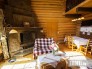 Главный дом представляет собой двухэтажное деревянное строение с выходом на террасу. Домашняя обстановка из натурального дерева создает атмосферу домашнего уюта и спокойствия. На первом этаже расположены каминный зал с обеденным столом и большим телевизором, зона кухни, русская печь с лежанкой, комната для гостей с 2-спальной кроватью, санузел с душевой кабиной. На втором этаже расположены комната для гостей с 2-спальной кроватью, две комнаты с двумя 1,5-спальными кроватями в каждой.